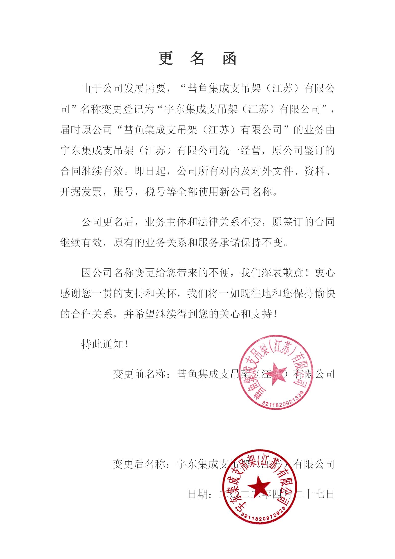 由于公司發展需要,“彗魚集成支吊架(江蘇)有限公司”名稱變更登記為“騰博游戲誠信為本官網”,屆時原公司“彗魚集成支吊架(江蘇)有限公司”的業務由騰博游戲誠信為本官網統一經營,原公司鑒訂的合同繼續有效。即日起,公司所有對內及對外文件、資料、開據發票,賬號,稅號等全部使用新公司名稱。